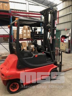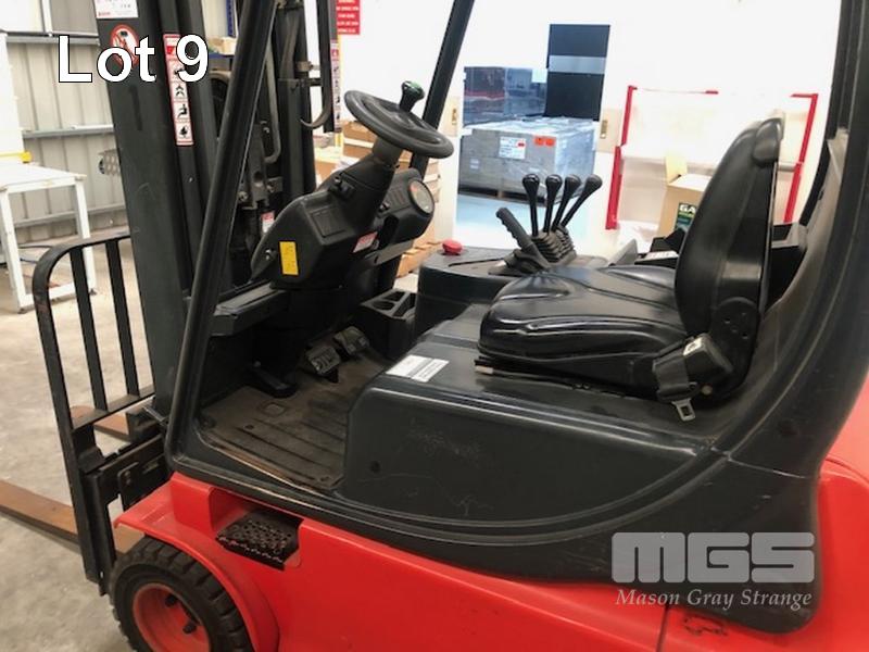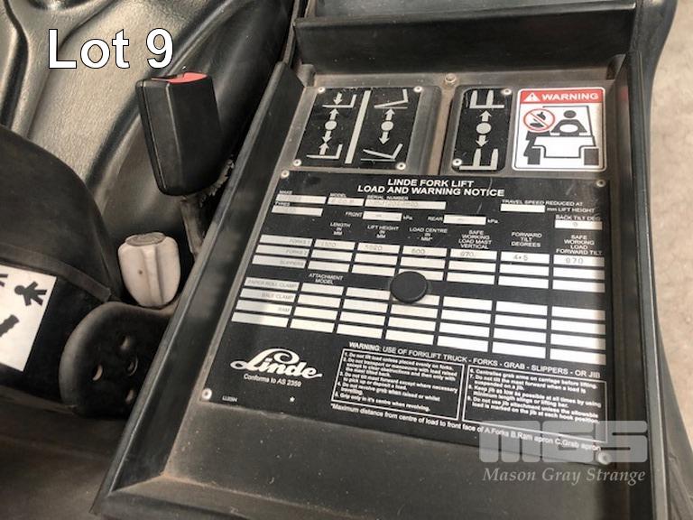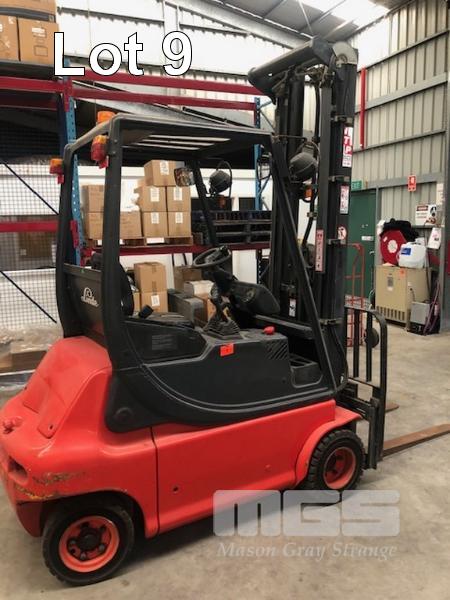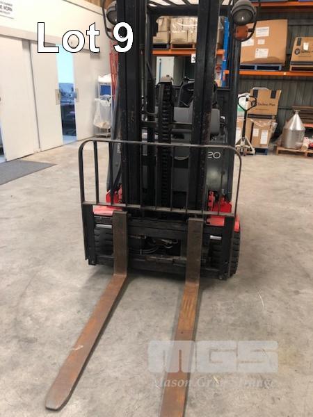 ELECTRIC FORKLIFT, LINDE MOD: E20P SERIAL: 335J12023620 1100mm FORKS, SOLID TYRES, SIDE SHIFT MAX LIFT HEIGHT: 5920mm 990 hrs SHOWING MAX LOAD @ 600mm CENTRES 970kg NEAR NEW BATTERY & CHARGER LIGHTS & REVERSE BUZZER