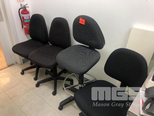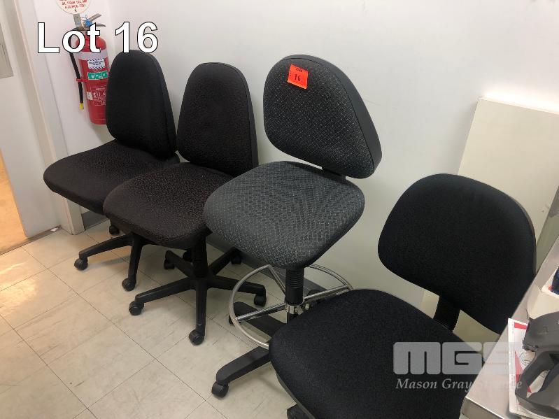 2 x OFFICE CHAIRS, BLACK CLOTH, SWIVEL GAS LIFT BASE AND 2 HIGH RISE TECH STOOLS, CLOTH, RISE & FALL