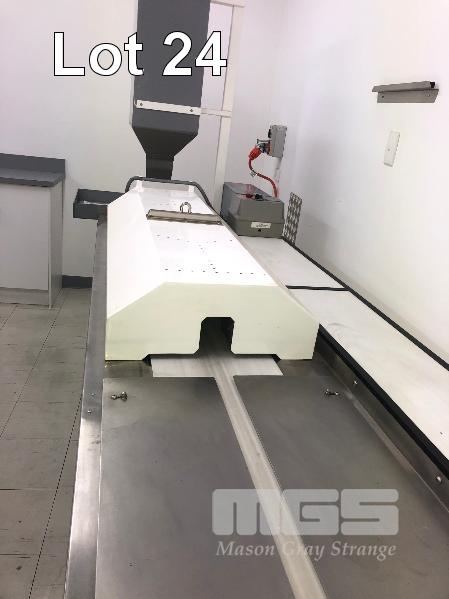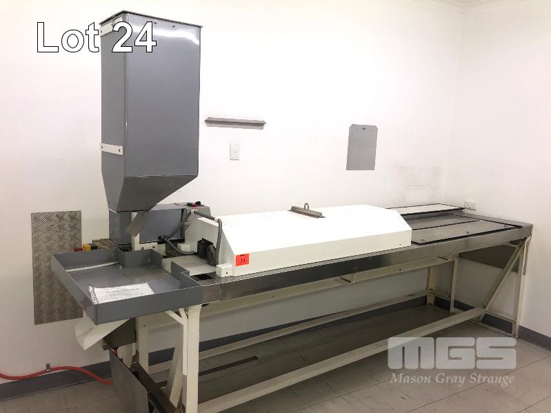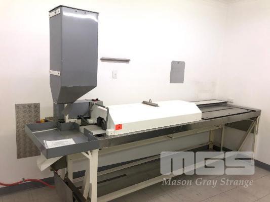 HEAT SHRINK TUNNEL 2800 x 300mm BELT, 415V E.S. FITTED, STEEL FRAME, STAINLESS STEELT OP PLASTIC INFEED HOPPER & PARTS TRAY