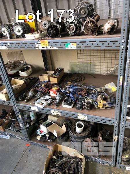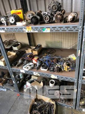 FORD COMPONENTS, STARTER MOTORS, ALTERNATORS, BRAKE DRUMS, AXLES, ETC, 3 x SHELVES