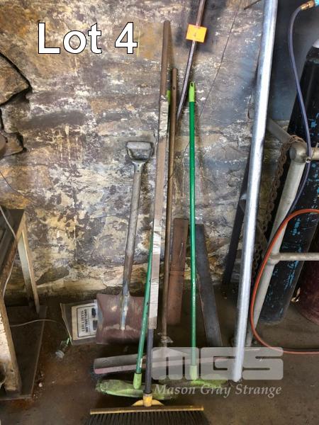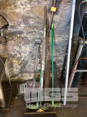 ASSORTED WORKSHOP BROOMS, SHOVEL, PINCH BAR, ETC