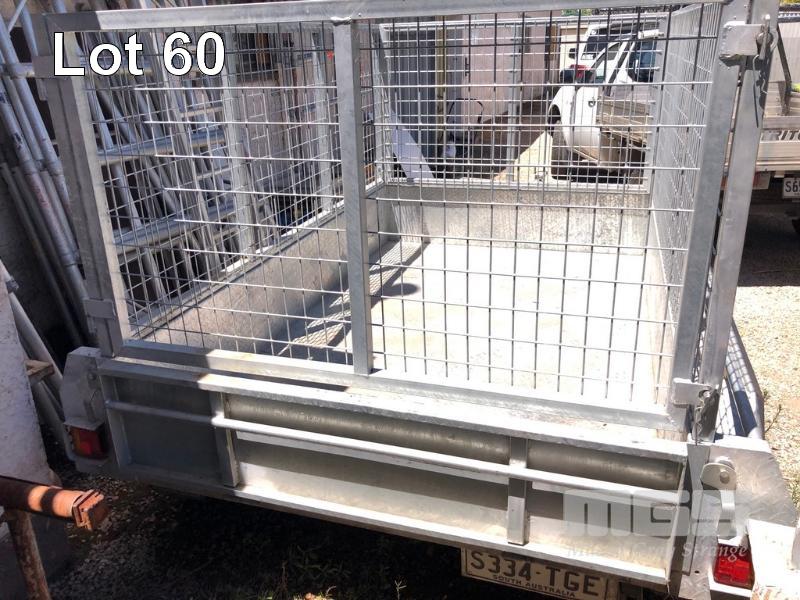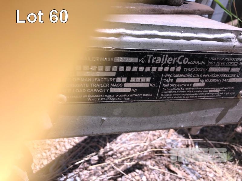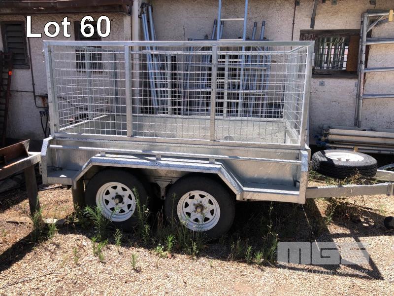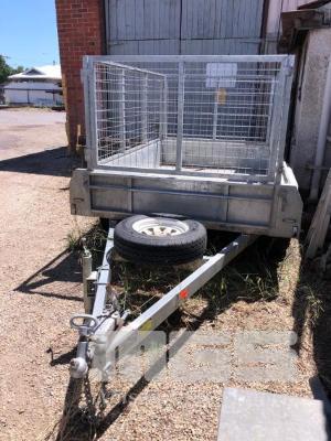05 / 2018 TRAILER CO 8x5' TANDEM AXLE TRAILER REG: S334 TGE VIN / CHASSIS: 6UGVS500000134340 FULL GALV WITH CAGE DUAL AXLE LED LIGHTS SPARE WHEEL 2 WHEEL BRAKES CAPACITY: 1,400kg JOCKEY WHEEL AS NEW CONDITION