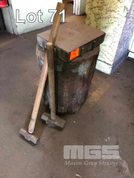 BLACKSMITH WORK BLOCK & 2 x SLEDGE HAMMERS, 280 x 380 STEEL BLOCK, 70mm THICK ON HARDWOOD LOG BASE.