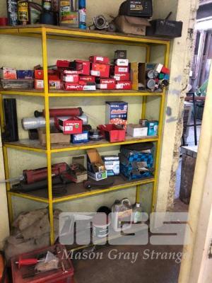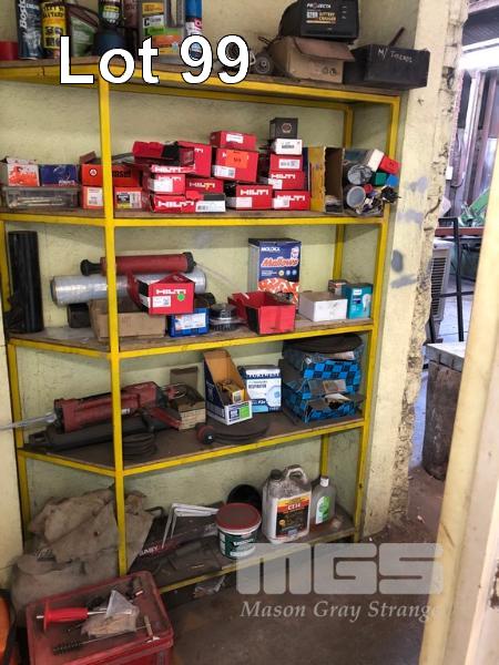 RACK & CONTENTS, HILTI HARDWARE, GRINDING & SANDING DISCS, ARC WELDING RODS, CT14, 5 LITRE, STRETCH WRAP