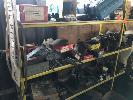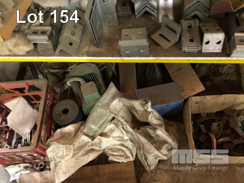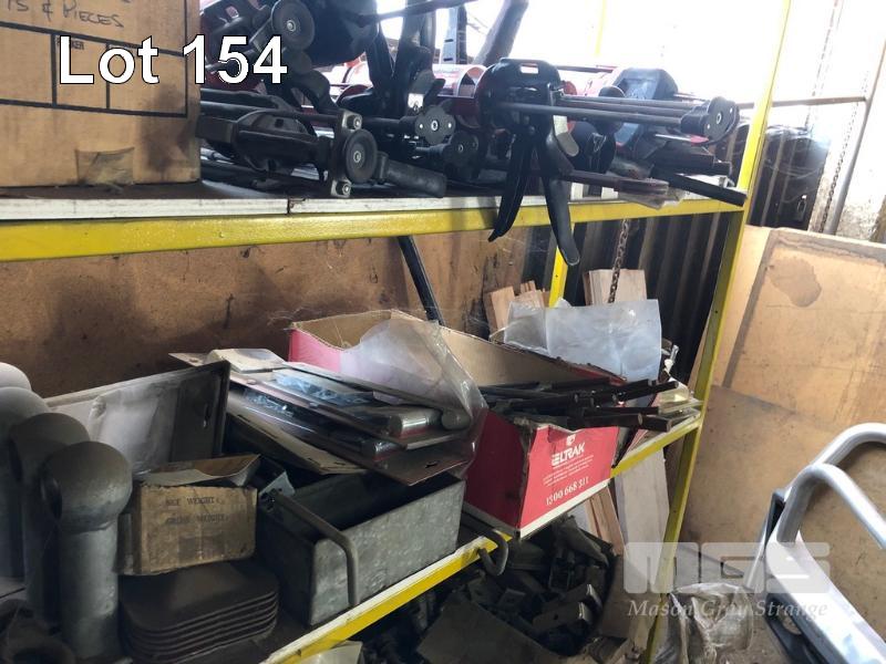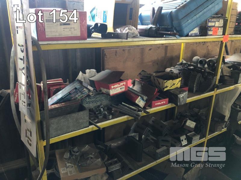 ASSORTED HARDWARE, HALF INCH LETTER PUNCHES, TURNBUCKLES, HILTI APPLICATORS, WELDING WIRE, BOLTS, GALV BRACKETS & CLAMPS, OILS, GREASE GUN, PNEUMATIC WHEELS, ETC, CONTENTS RACK