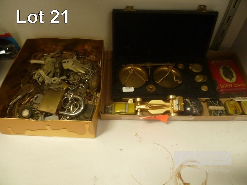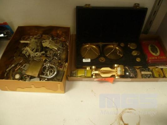 SMALL LOCKS & KEYS, TINS, GOLD SCALE, ETC, 2 x TRAYS
