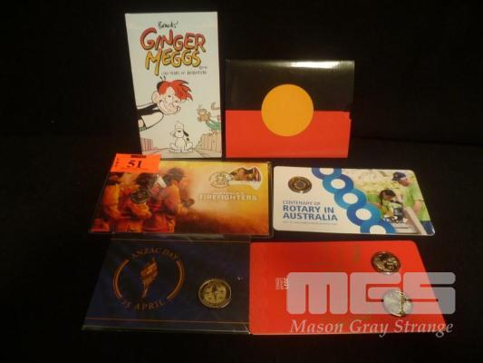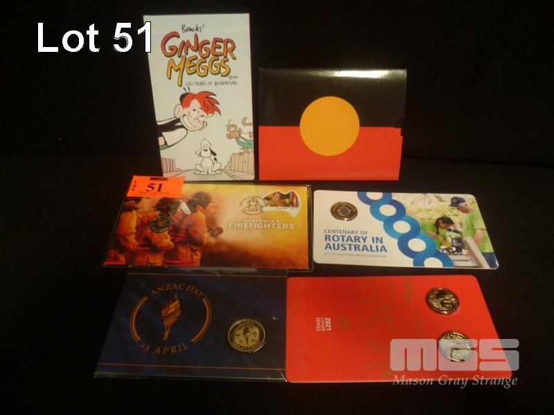 6 x COMMEMORATIVE COIN SETS, AUSTRALIAN FIREFIGHTERS, GINGER MEGS, ANZAC DAY, ROTARY, ONE FLAG, MANY NATIONS & LUNAR SERIES