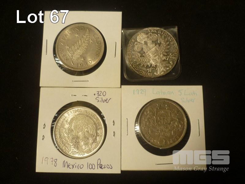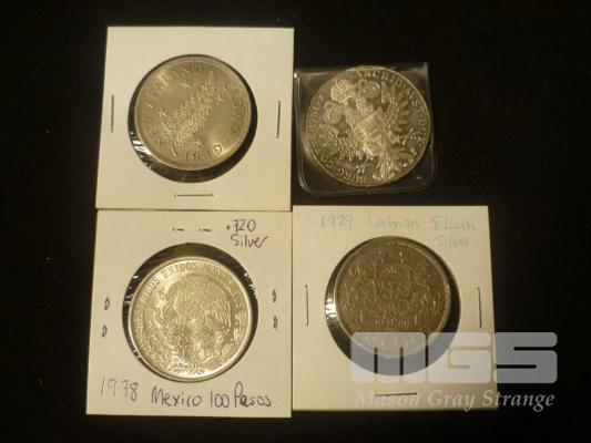 1929 LATVIAN 5 LATI SILVER COIN, 1780 AUSTRIAN 1 THALER RESTRIKE, 1978 MEXICAN 100 PASOS SILVER COIN, .720 SILVER, 1949 NEW ZEALAND CROWN