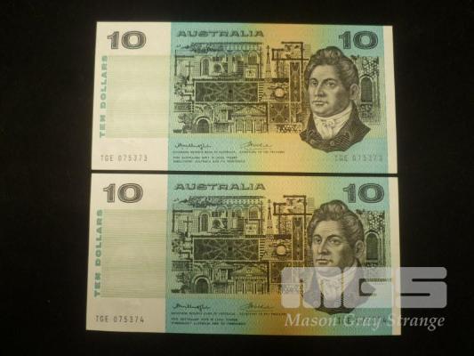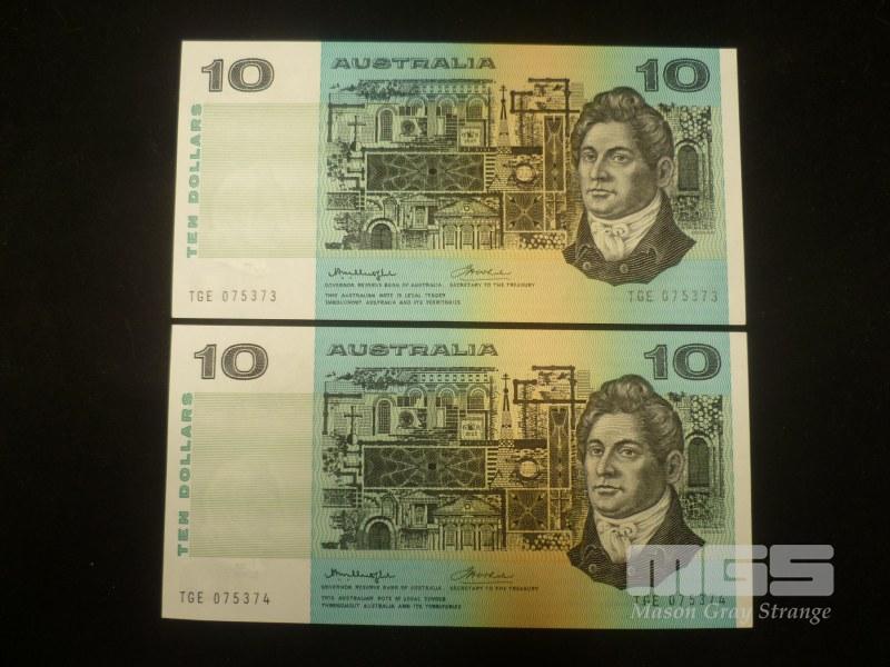 2 X 1976 AUSTRALIA CONSECUTIVE $10 PAPER BANKNOTES, 'GOTHIC' CENTRE THREAD, KNIGHTS/WHEELER