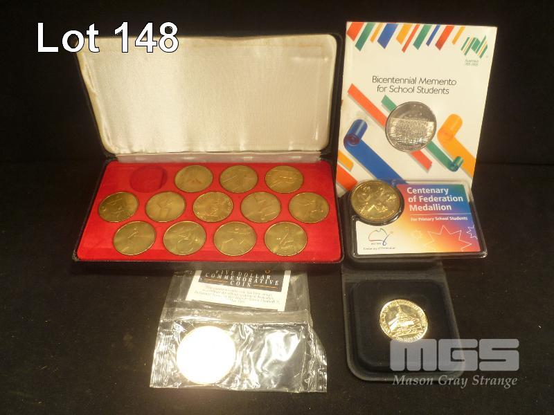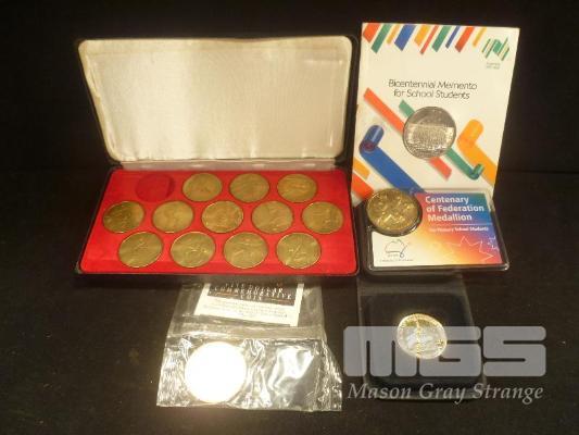AUSTRALIA, MR ROBERTS BRISBANE 1982 MEDAL SET (1 X MISSING), 1988 STUDENT MEMENTO MEDAL, 1988 $5 DOLLAR COIN, 1988 BRASS OPENING OF PARLIAMENT HOUSE, 2001 CENTENARY MEDALLION