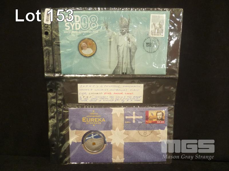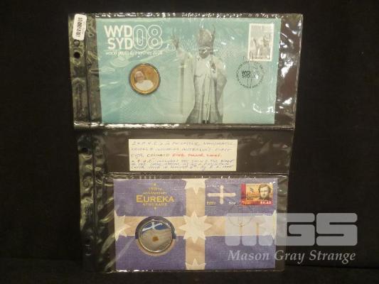 AUSTRALIA, 2008 WORLD YOUTH DAY SYDNEY POPE, $1 COLOURED PNC STAMP SET & 2004 $5 150th ANNIVERSARY, 'EUREKA STOCKADE, COIN & STAMP COVER PNC SET