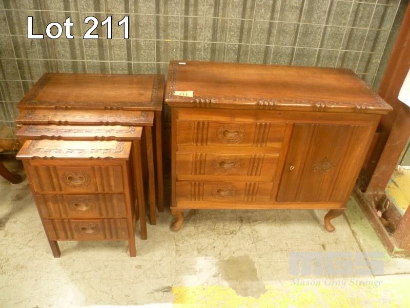 MAHOGANY SIDE CABINET, SINGLE DOOR, 3 DRAWER WITH MATCHING NEST 3 TABLES WITH 3 DRAWER UNIT