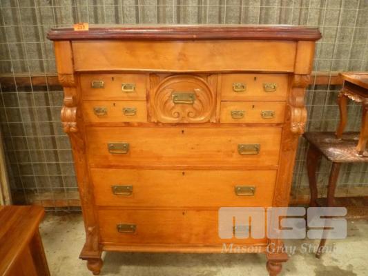 HUON PINE CHEST OF 8 DRAWERS, CARVED COLUMNS, BRASS HANDLES