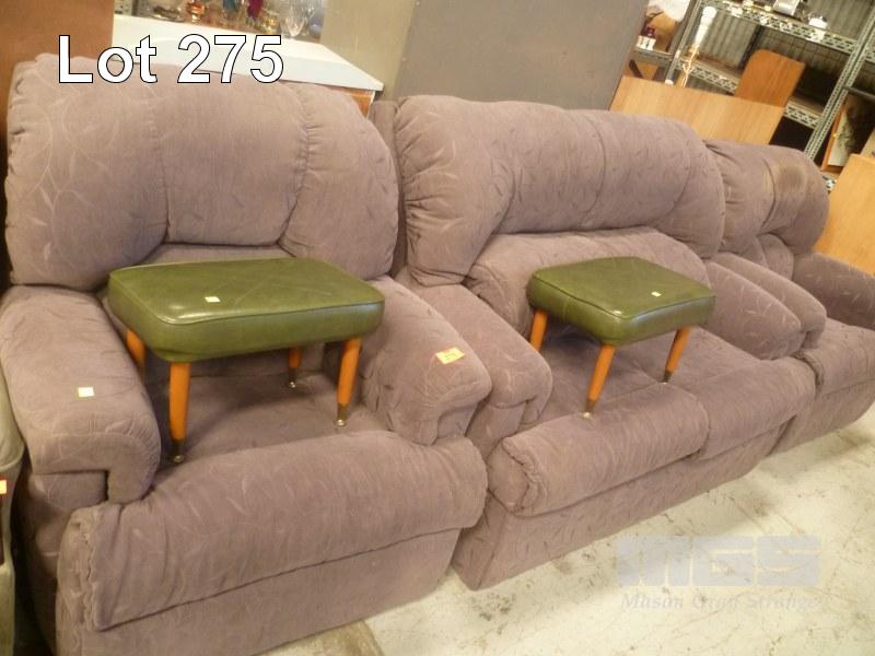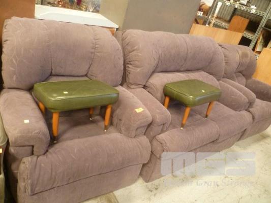 PURPLE FABRIC UPHOLSTERED 3 PIECE LOUNGE SUITE, 2 SEATER & 2 x RECLINER ARMCHAIRS