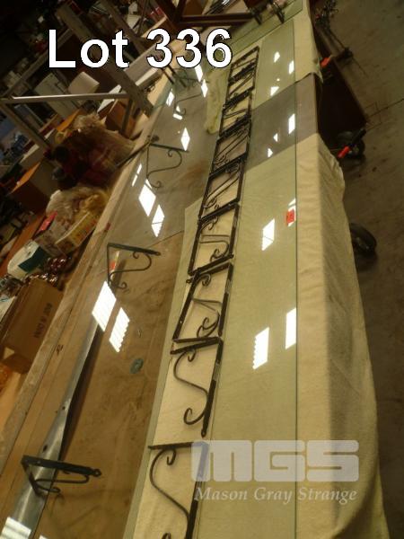 4 x GLASS SHELVES, METAL BRACKETS (2 x 300cm & 2 x 129cm)