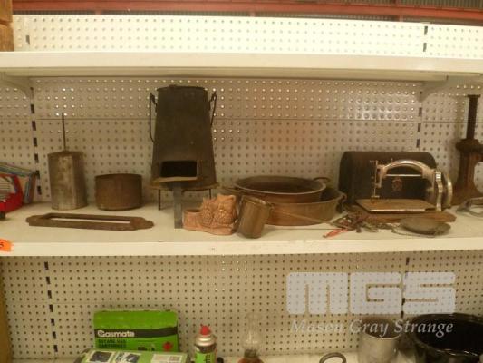 SMALL FURNACE, GOLD PANNING TRAYS, SMALL VINTAGE SEWING MACHINE ETC