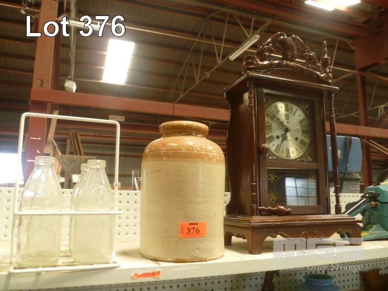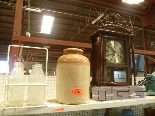 VINTAGE MILK BASKET WITH BOTTLES, 31 DAY CLOCK, COMPLETE & JESSOP & CO JARDINE