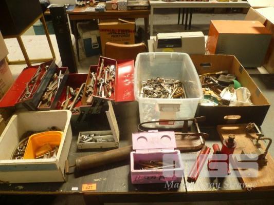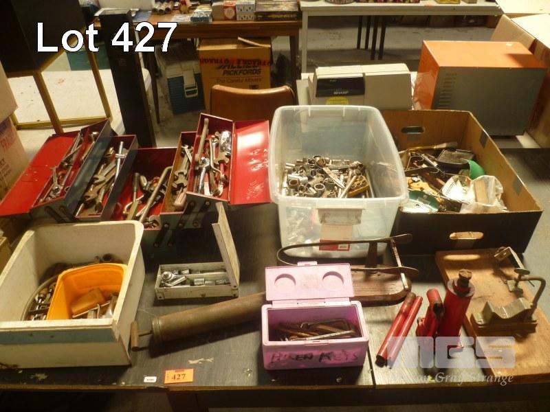 ASSORTED MECHANICS TOOLS, SOCKETS, SPANNERS, RATCHETS, JACK, GREASE GUN, ETC, 1 x TABLE