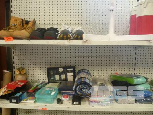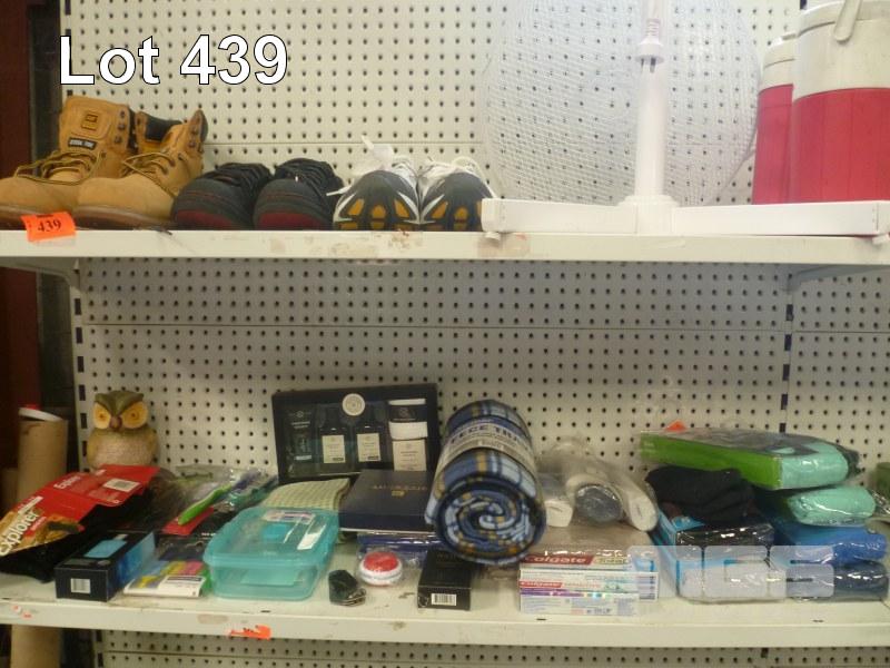SAFETY BOOTS, SIZE 9 & 10, OK SNEAKERS, SIZE 8, PEDESTAL FAN, TOILETRIES, UNDERWEAR, ETC, 2 x SHELVES