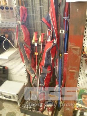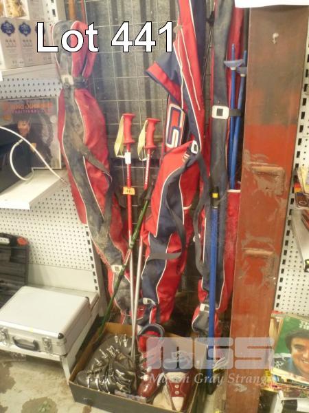 3 x SETS SNOW SKIS IN CARRY BAGS, 2 x PAIR OLD SCHOOL SKI BOOTS & ASSORTED STOCKS