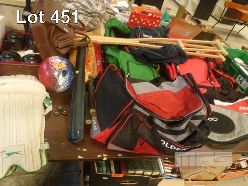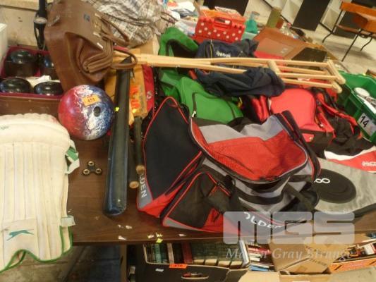 ASSORTED SPORTING BAGS & EQUIPMENT INC CRICKET, TEN PIN BOWLING, LAWN BOWLS, ETC 1 x TABLE
