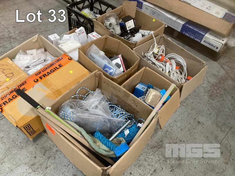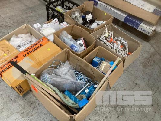 ASSORTED LIGHT & POWERPOINT FITTINGS, SHUTTER RELAYS & POWER LEADS 1 x PALLET