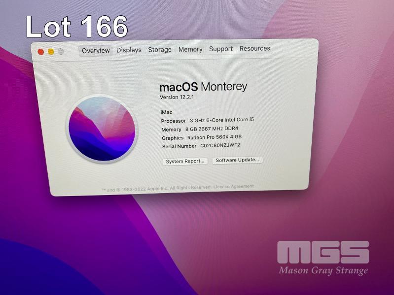 APPLE iMAC (A2116), CORE i5 8500 (8TH GEN) @ 3GHz, 8GB DDR4 RAM, 256GB NVMe SSD, BUILT-IN 21.5" RETINA DISPLAY (4096x2304), 4GB AMD RADEON PRO 560X VIDEO, Wi-Fi, USB-C, MAC OS 12 INSTALLED (WITH AS NEW WIRELESS KEYBOARD (A2450) & WIRELESS MOUSE (A1657) NO CABLE) S/N:C02C80NZJWF2