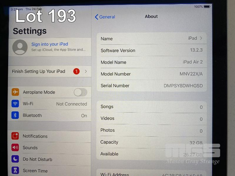 APPLE iPAD AIR 2, 32GB, Wi-Fi, SPACE GREY, MODEL A1566 (NO CABLE, NO CHARGER) S/N:DMPSY8DWHG5D