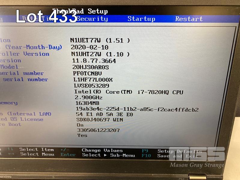 LAPTOP, LENOVO THINKPAD P51 MOBILE WORKSTATION (20HJS0AR0S), CORE i7 7820HQ (7TH GEN) @ 2.9GHz, 16GB DDR4 RAM, 512GB NVMe M.2 SSD, 15.6" WIDESCREEN (1920x1080), 4GB NVIDIA QUADRO M2200 VIDEO, Wi-Fi, BLUETOOTH, WINDOWS 10 PRO INSTALLED & POWER SUPPLY (NOTE: MARKS ON SCREEN) S/N:PF0TCNBV