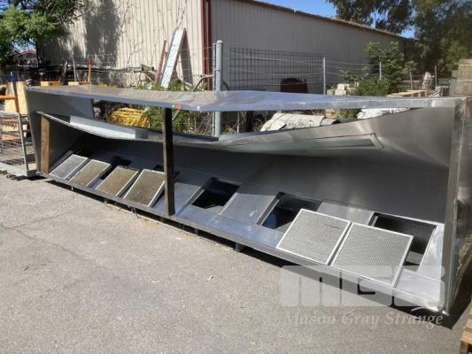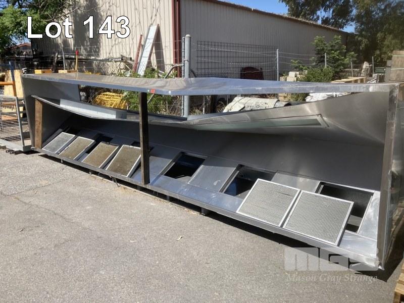 STAINLESS STEEL EXHAUST CANOPY, 600 x 140 x 110cm, 6 FILTER, INTERNAL LIGHTING WITH 2 x EXTRACTION FANS, (240V) & FLUE (NOTE SOME DAMAGE)