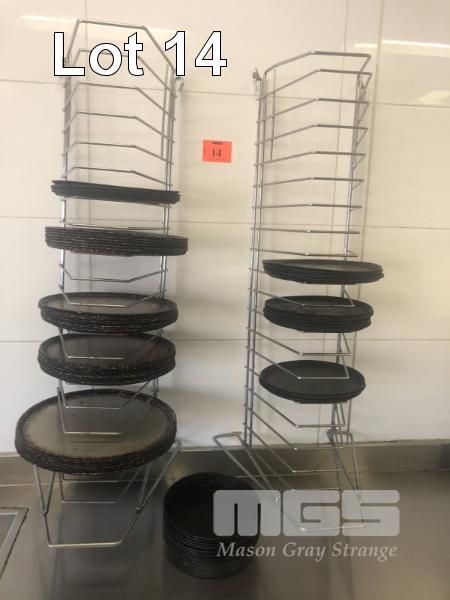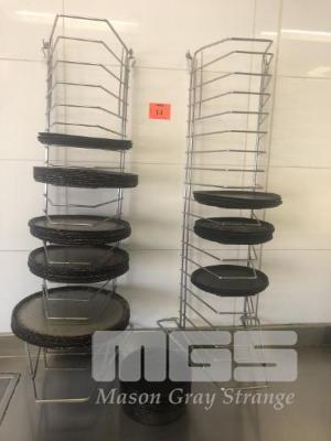 2 x PIZZA TRAY HOLDERS WITH ASSORTED STAINLESS STEEL PIZZA TRAYS