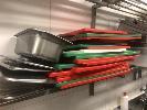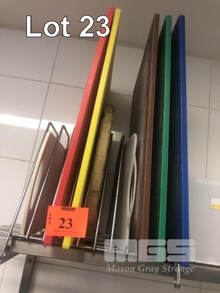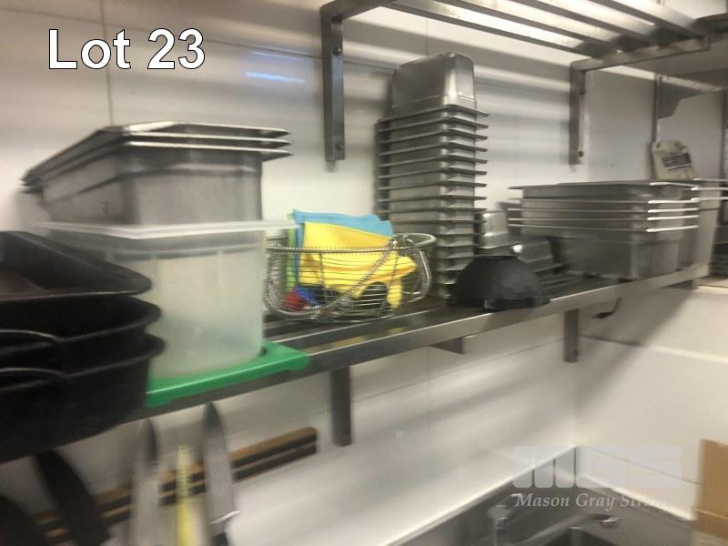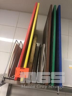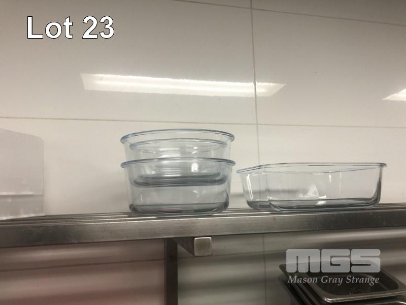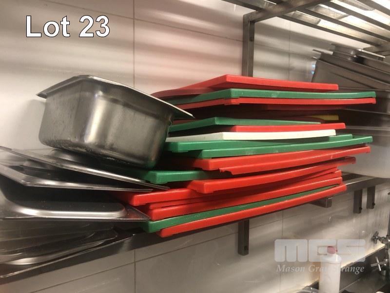 CONTENTS OF 2 SHELVES INCLUDING, CHOPPING BOARDS, PLASTIC CONTAINERS, COLANDERS, JUGS, GLASS OVEN SAFE BOWLS, GASTRONORM TRAYS, AND MORE!