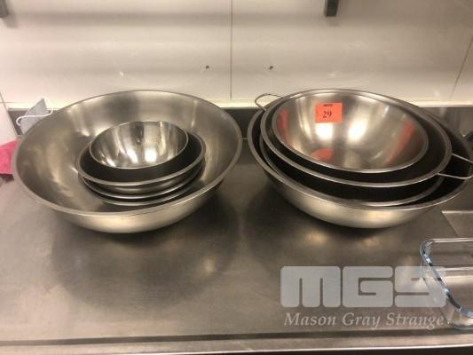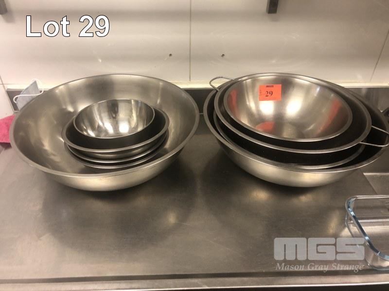 8 x STAINLESS STEEL BOWLS, 1 STAINLESS STEEL COLANDER, SIZES FROM 210mm to 470mm