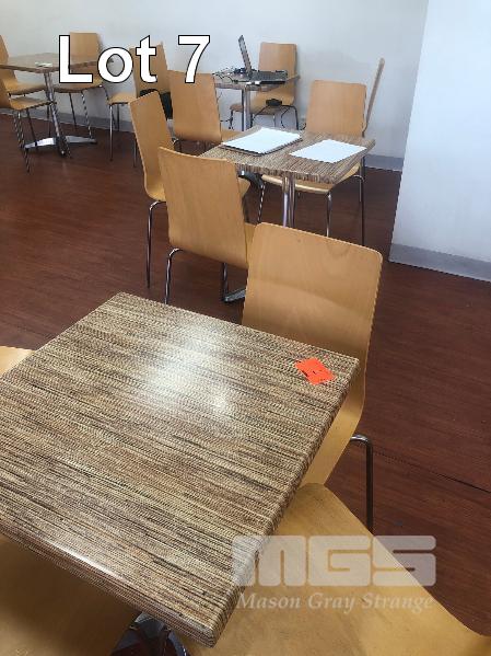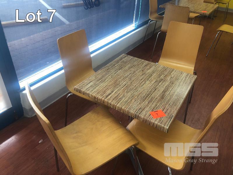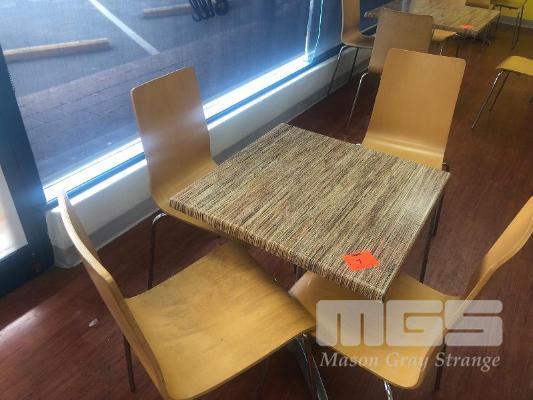 3 x CAFE TABLES, COMPOSITE TOPS, 600 x 600mm, 12 x CURVED TIMBER CHAIRS, CHROME LEGS. MADE IN ITALY