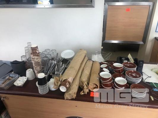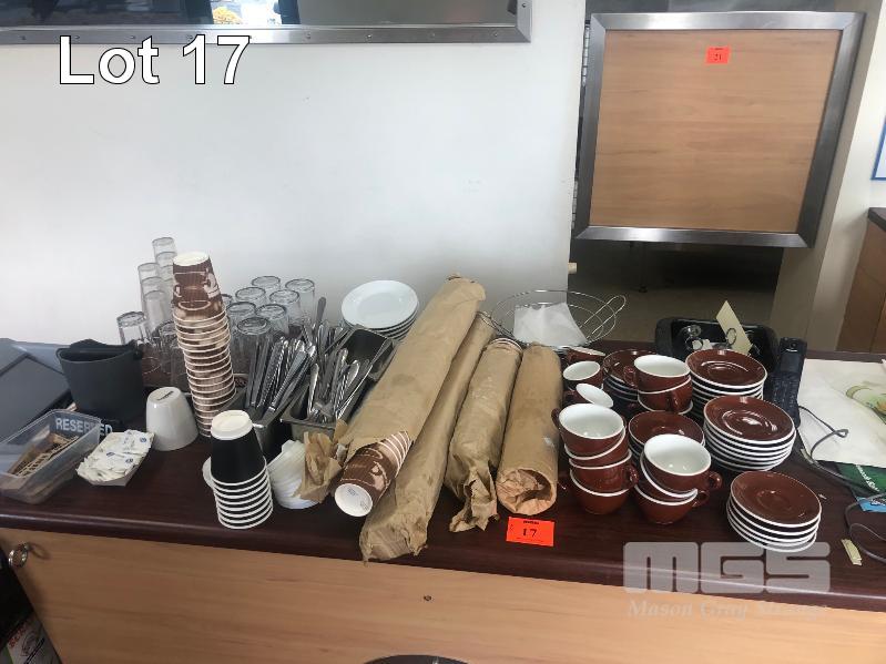 QUANTITY OF COFFEE CUPS & SAUCERS, GLASSWARE, TAKEAWAY CUPS, 40 x FORKS, 40 x KNIVES, 15 x SPOONS, 4 x STAINLESS STEEL TRAYS, HANDSFREE PANASONIC PHONE & BASE, DISPOSEABLE CUPS etc.