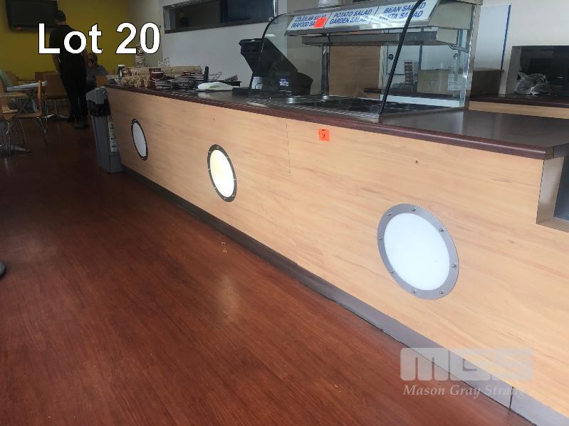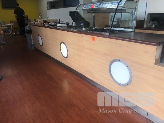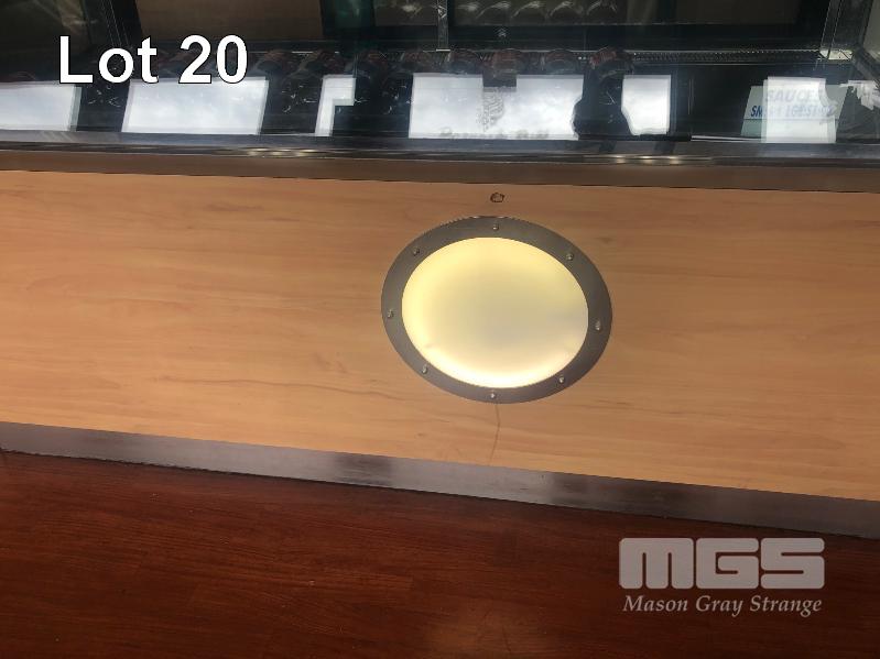 TIMBER LAMINATE SHOP COUNTER, 6000 x 900mm, WITH BUILT IN LIGHTING & SHELVES (BUYER TO REMOVE)