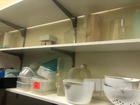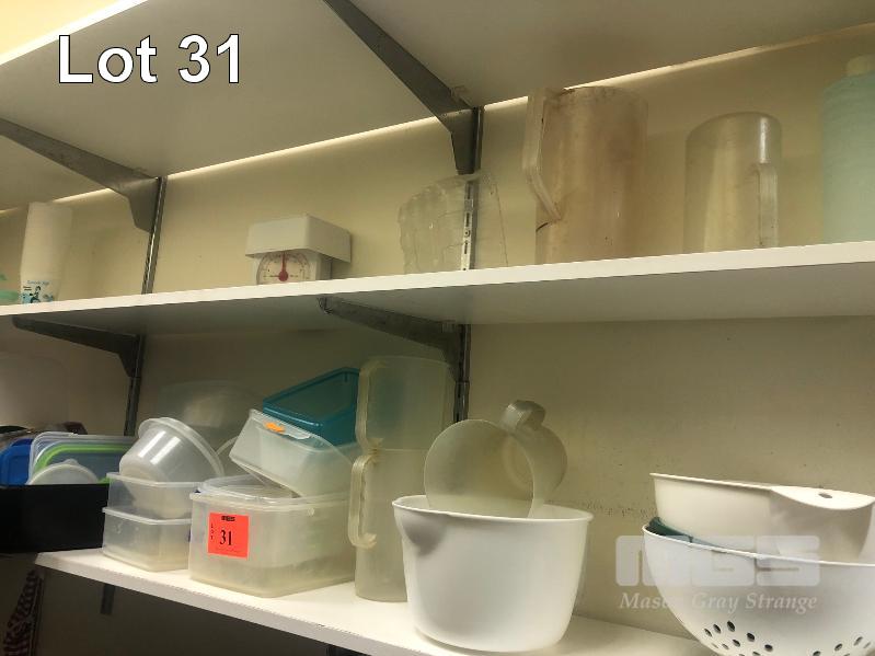 ASSORTED PLASTIC BOWLS, CONTAINERS, COLANDERS, JUGS, STAINLESS STEEL SIEVE, TONGS & WISK