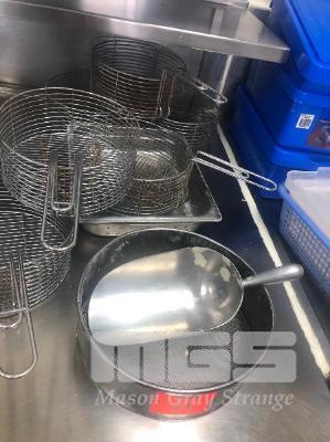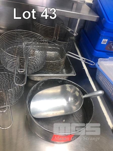 6 x DEEP FRYER BASKETS, ROUND, 1 x STAINLESS STEEL SIEVE, ALLOY SCOOP, STAINLESS STEEL DRAIN TRAY
