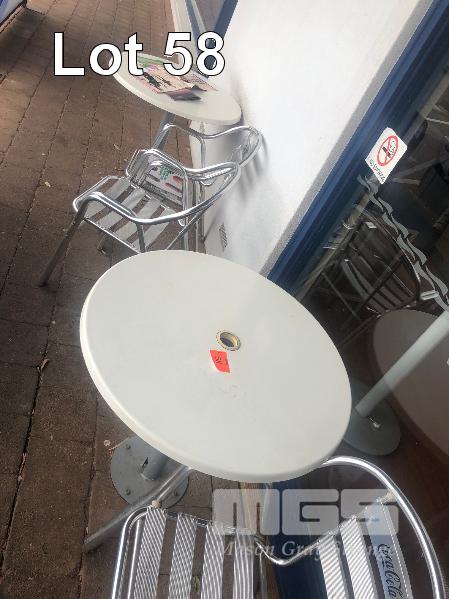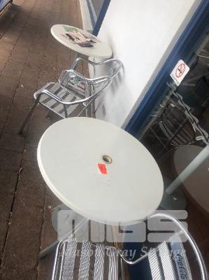 2 x OUTDOOR ROUND PEDESTAL TABLES, 800mm, 3 x ALLOY CHAIRS