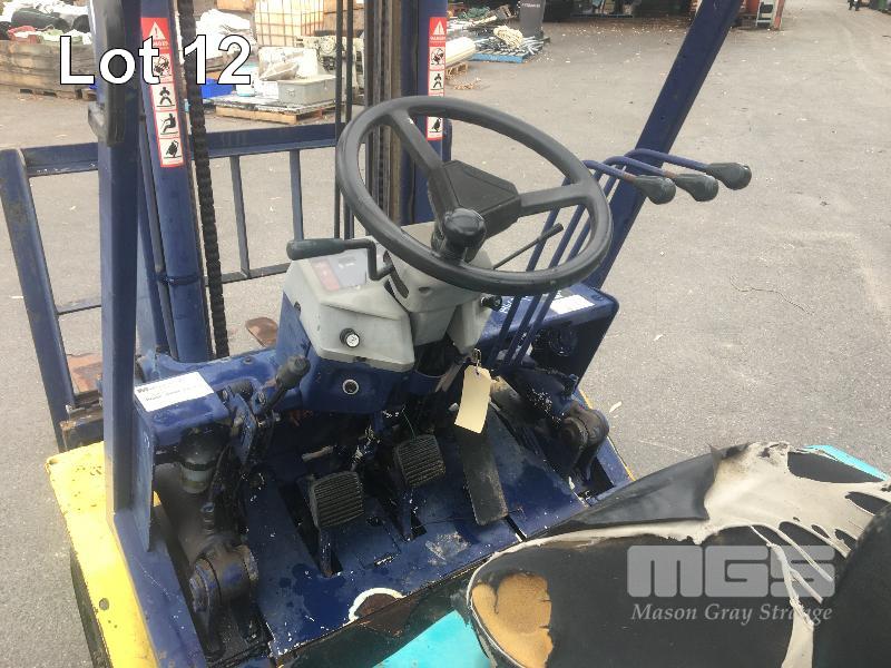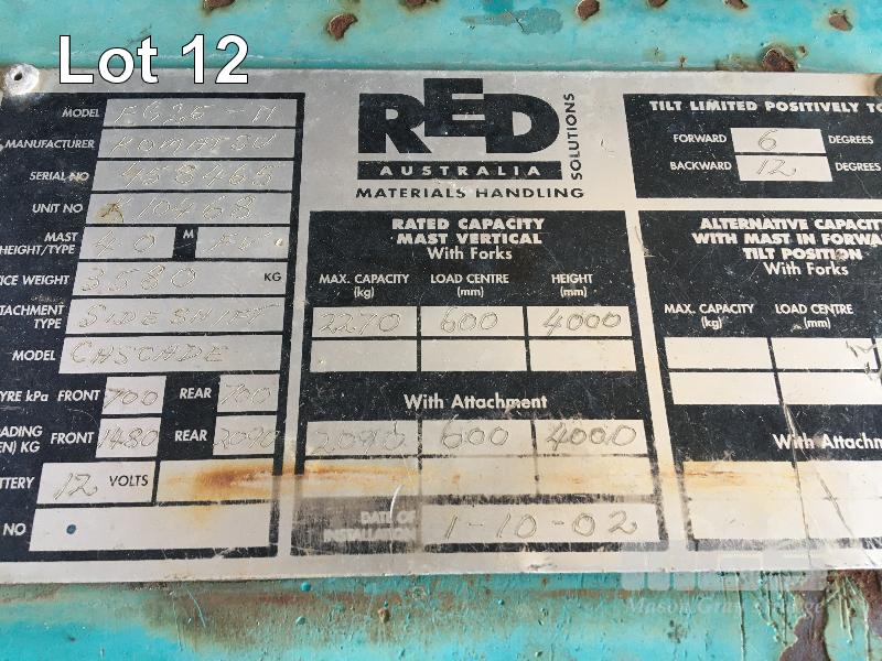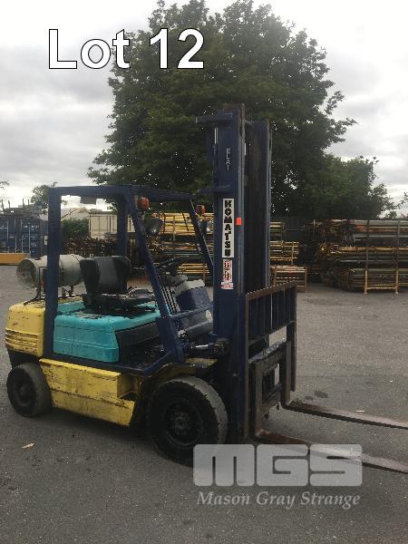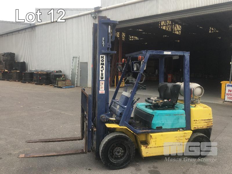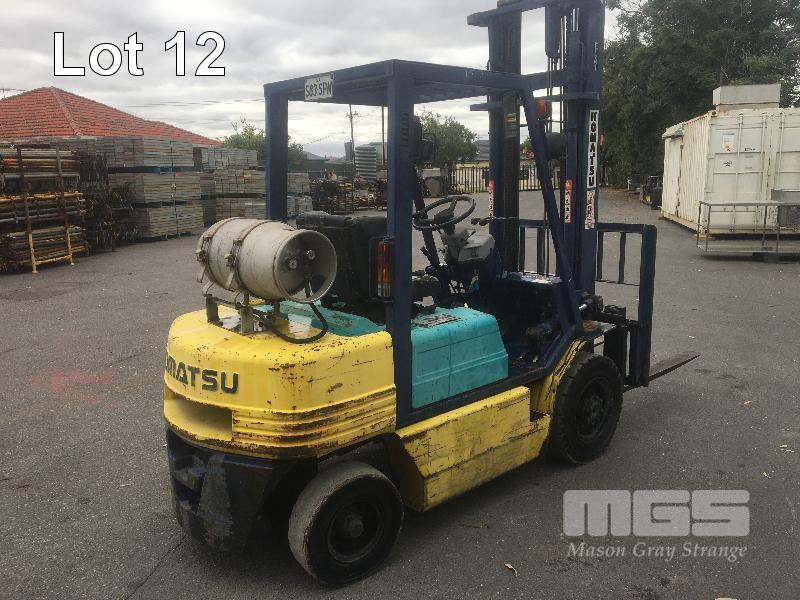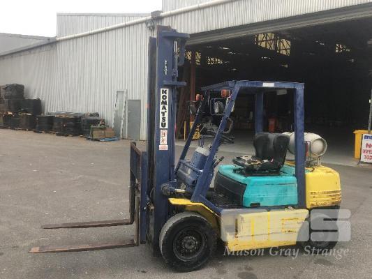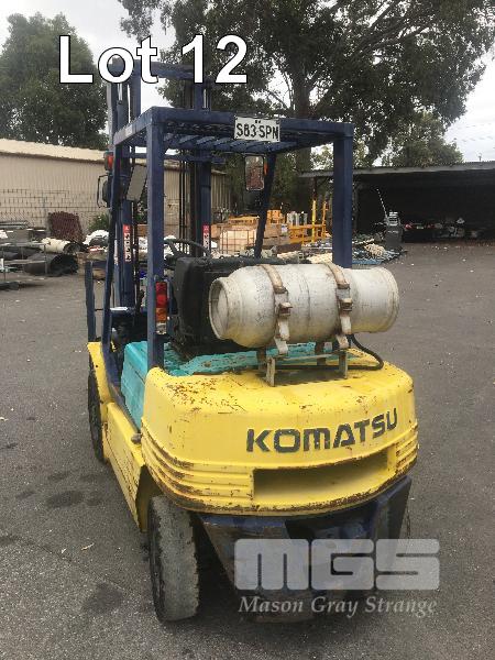 FORKLIFT, KOMATSU MOD: FG25-TL MAX LOAD 2270 KG @ 600MM LOAD CENTER MAX LIFT HEIGHT 4000MM 2 STAGE MAST HOURS: 8,187 SHOWING SOLID TYRES, SIDE SHIFT, TWO STAGE MAST 4 CYLINDER LPG ENGINE ( FLAT BATTERY ) KEY#11