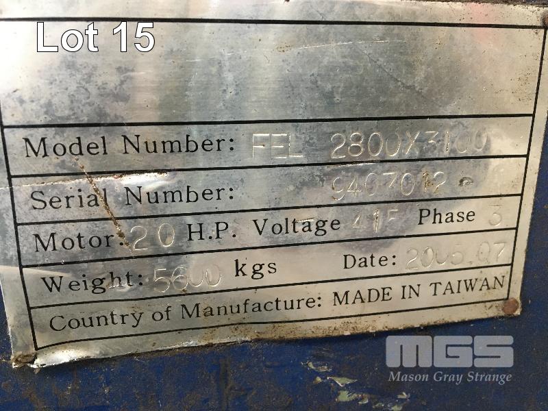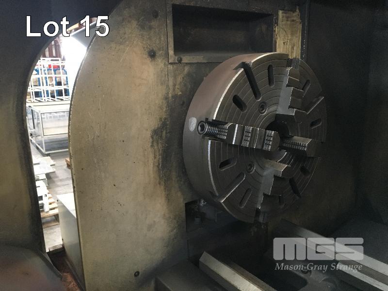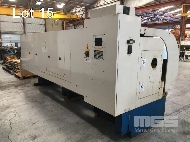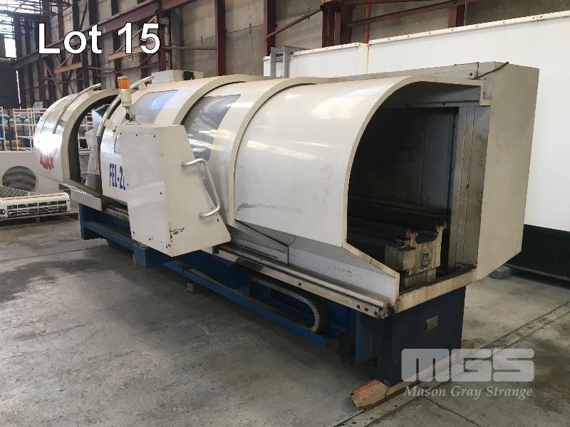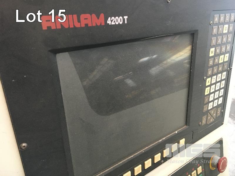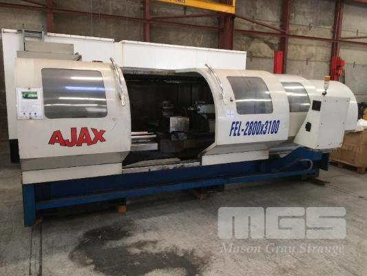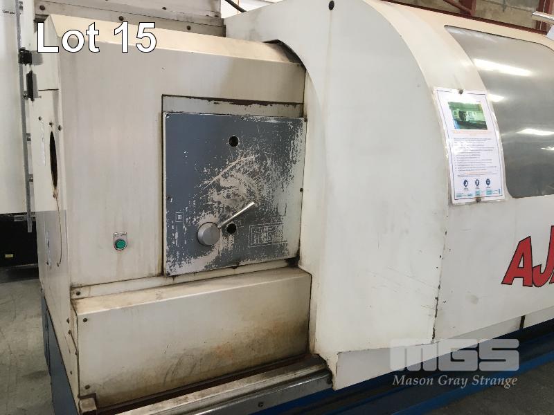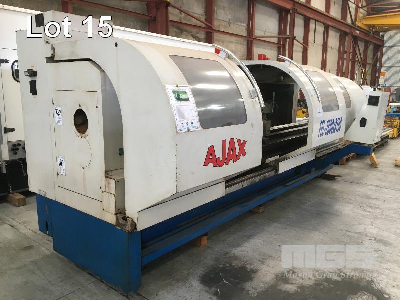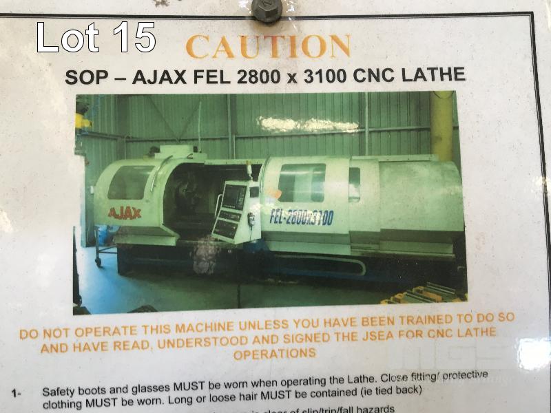 2005 AJAX CNC LATHE MOD: FEL2800x3100 S/NO: 9407012 GAP BED LENGTH: 3800mm BAR FEED DIA: 105mm 4 JAW CHUCK, 500mm DIA TOOL HOLDER ANILAM DIGITAL CONTROLLER MOD: 4200T WEIGHT: 5,600kg 20HP, 415V NOTE: TOOL CHANGE MOTOR IS ALL FAULTS, BUT THERE IS A NEW MOTOR FOR IT INCLUDED.