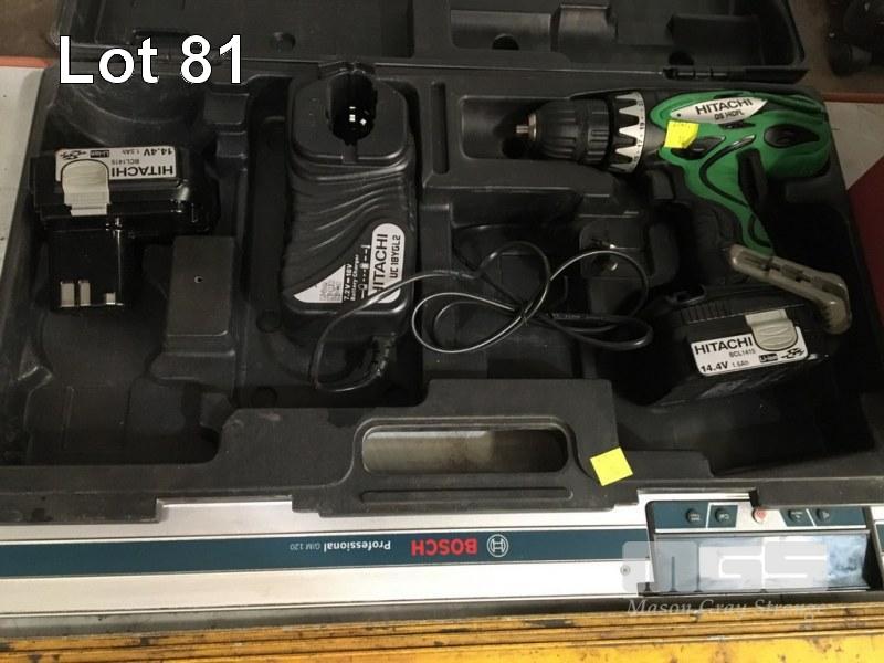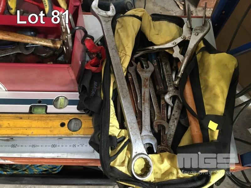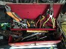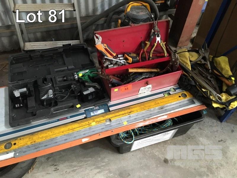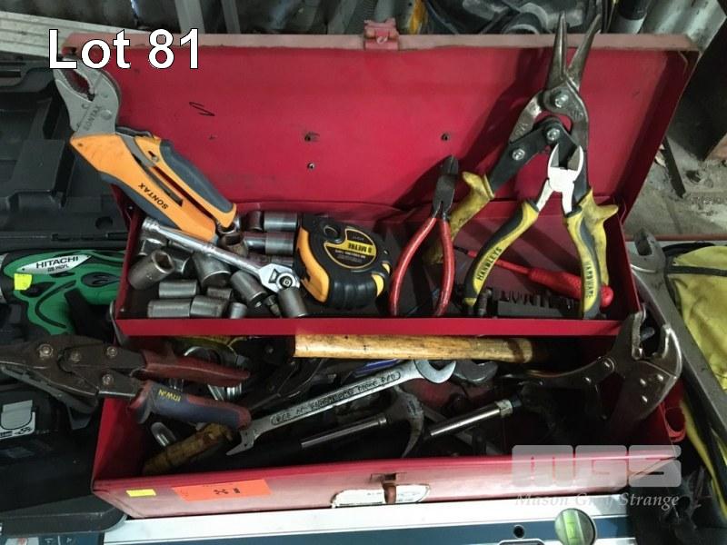 TOOLBOX & ASSORTED HAND TOOLS, VICE GRIPS, CUTTERS, SOCKETS, REPCO 1/4" RATCHET, SPANNERS, 18" SHIFTER, LEVELS, HITACHI CORDLESS DRILL WITH 2 x BATTERIES & CHARGER, ETC