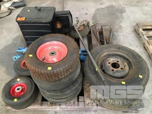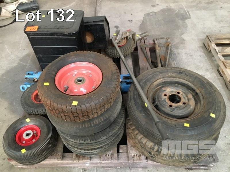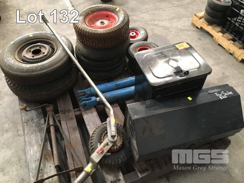 PAIR HYDRAULIC RAMS, 75mm DIA x 600mm STROKE, 2 x VEHICLE MOUNT TOOL BOXES, JOCKEY WHEEL, RATCHET TYPE & 10 x ASSORTED TYRES & RIMS, SUIT BUGGIES, TROLLIES, ETC, 1 x PALLET