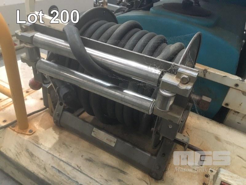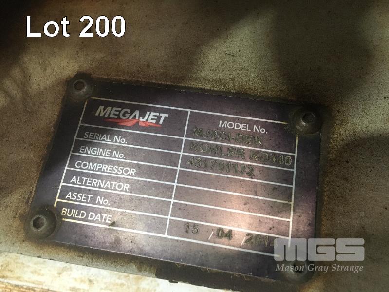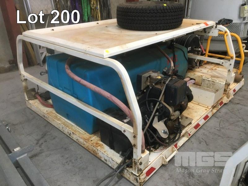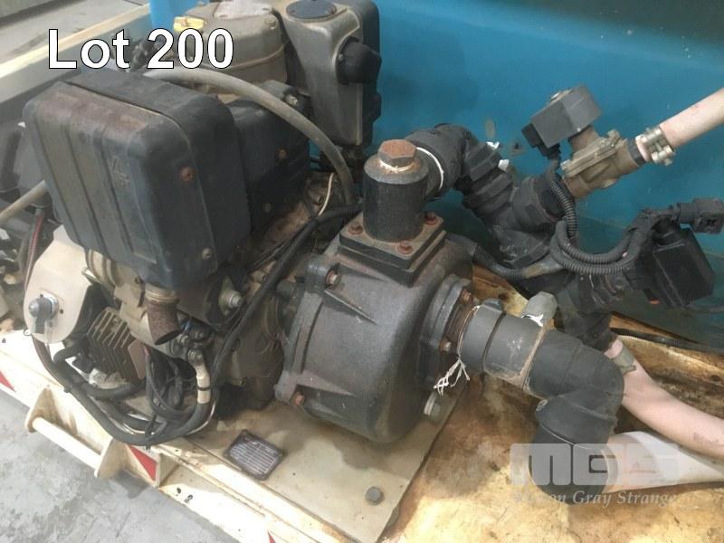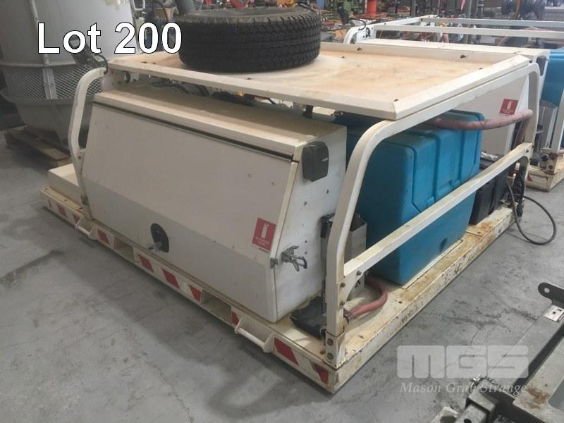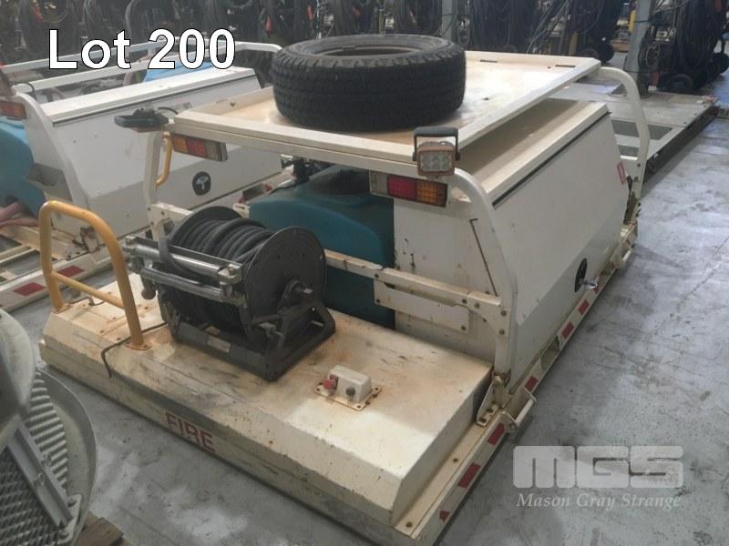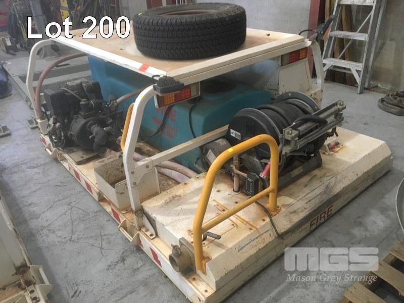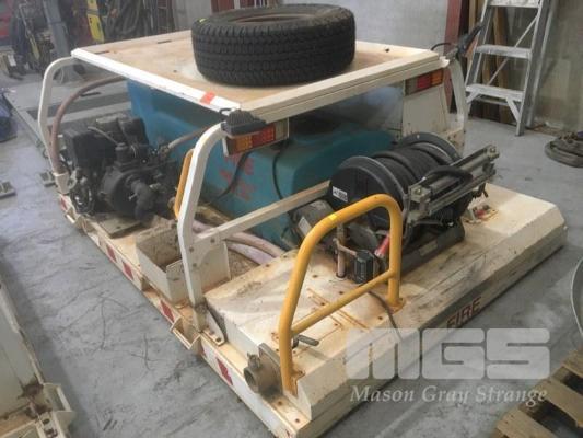 FIRE FIGHTING UNIT, STEEL SKID BASE FITTED WITH 400 LITRE POLY TANK MEGAJET DIESEL ENGINE WATER PUMP MOD: MJ2CI-DEK DOM: 2014 RETRACTABLEL FIRE HOSE REEL, HANNAY WITH SIDE MOUNT STORAGE COMPARTMENT HINGED LID, SKID BASE IS FITTED WITH FORK POCKETS, INDICATORS, LIGHTS, SPARE WHEEL, ETC, SUIT MOUNTING TO TRAILER, TRUCK OR UTE 2400 (L) x 1800 (W) x 950mm (H)