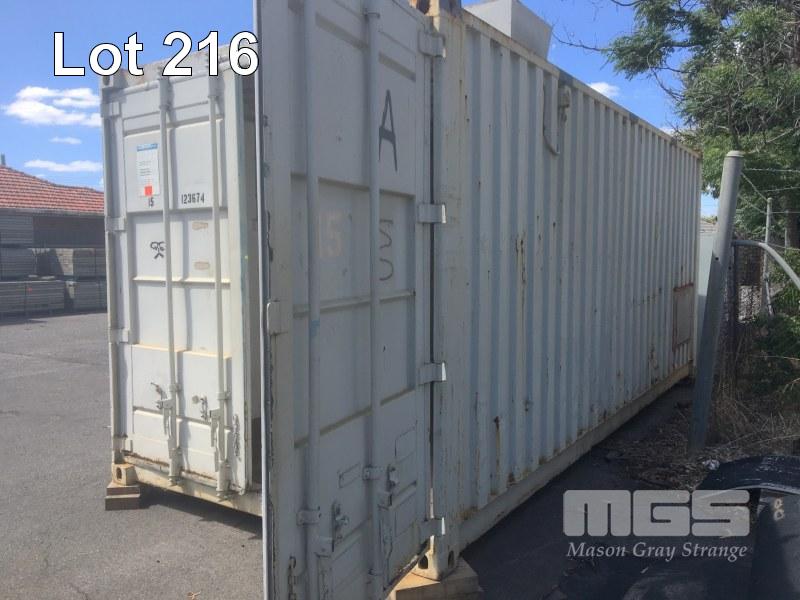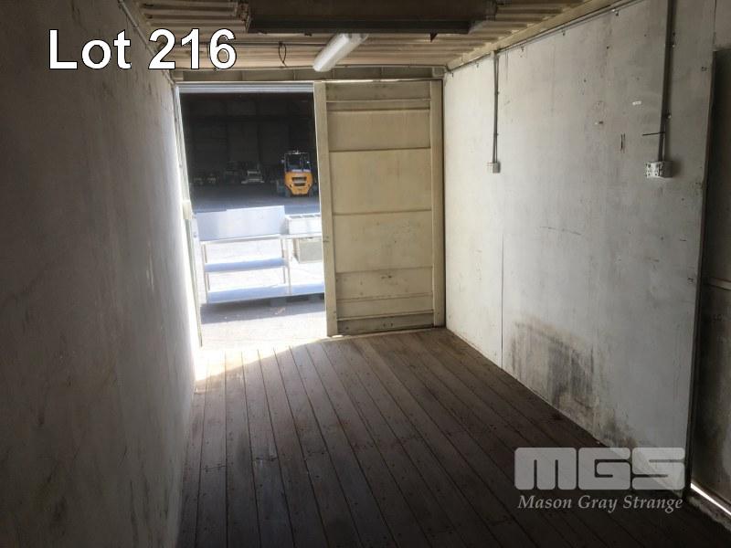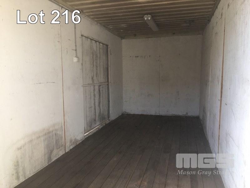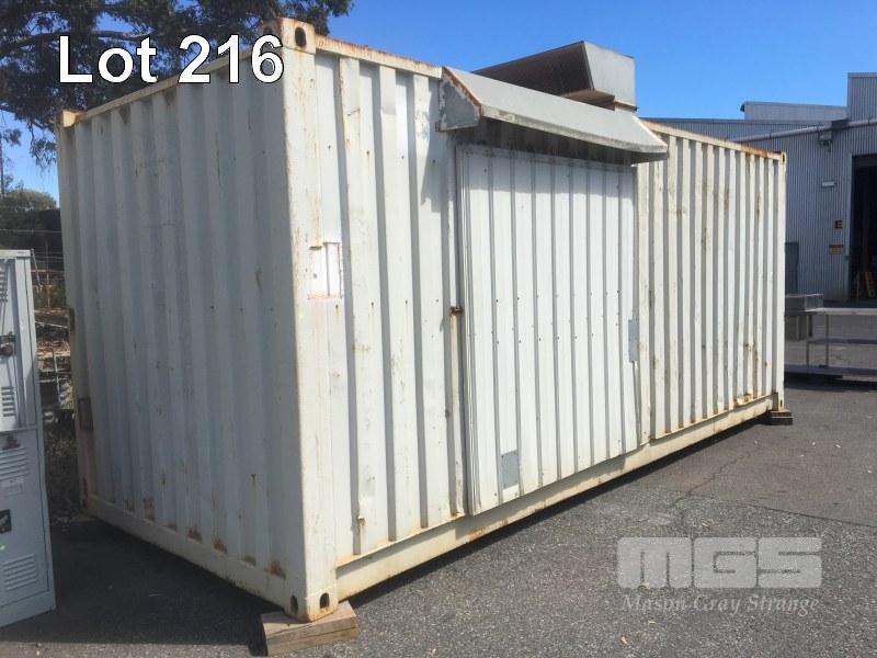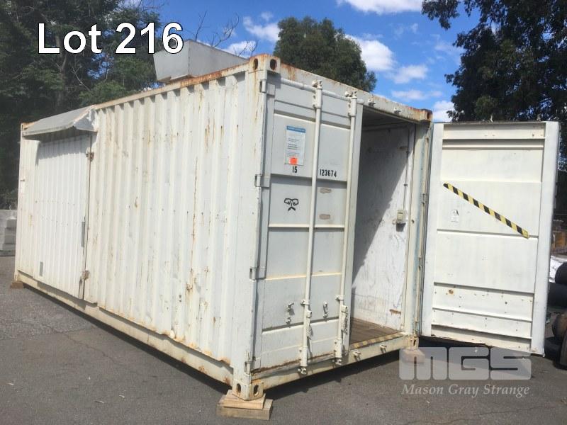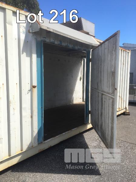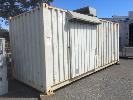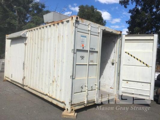 20' SHIPPING CONTAINER, MODIFIED WITH SWING OPEN SIDE DOOR, POWER, INTERNAL LIGHTING, AIR VENT, WHITE, SOME SMALL RUST HOLES