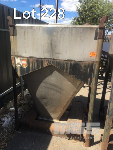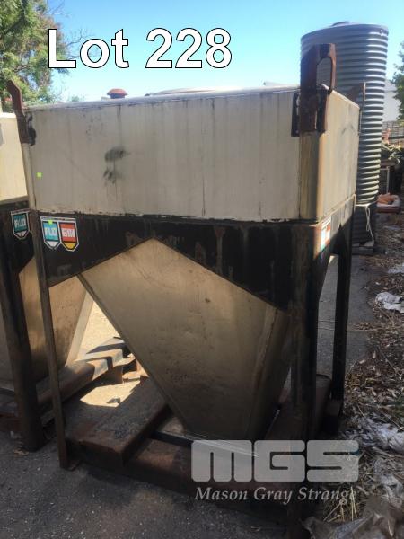 IBC FLO-BIN, STAINLESS STEEL TRANSPORT CONTAINER SUIT POWDER/GRANULAR PRODUCTS TAPERED BOTTOM WITH SLIDE DOOR OUTFEED 2 WAY FORK POCKETS 4 POINT TOP LIFTING LUGS, 500mm TOP INLET WITH SECURE LID & TOP VENT 1320 x 1100 x 1900mm (H)