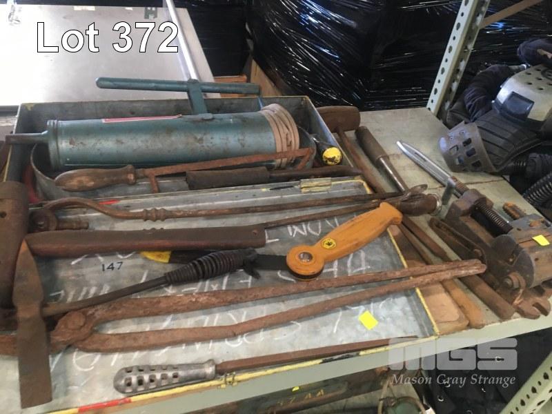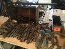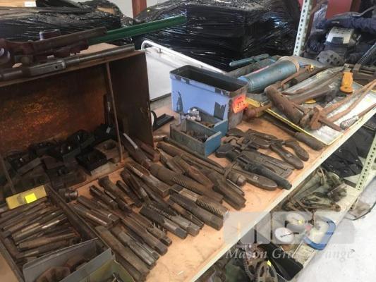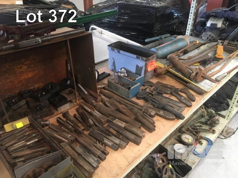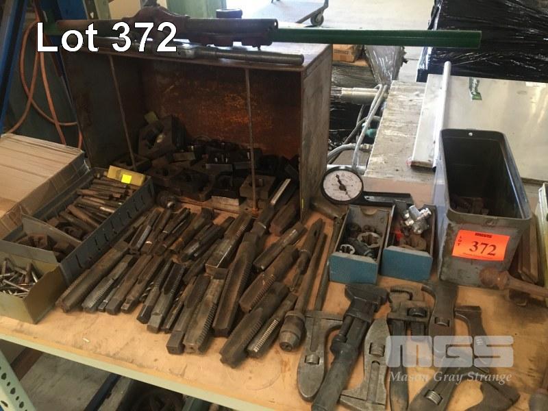ASSORTED VINTAGE HAND TOOLS, INC SHIFTERS, VICE, TAPS & DIES, ETC, 1 x SHELF