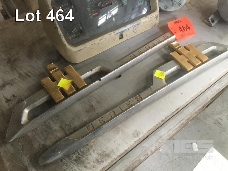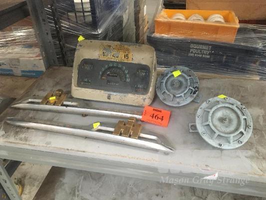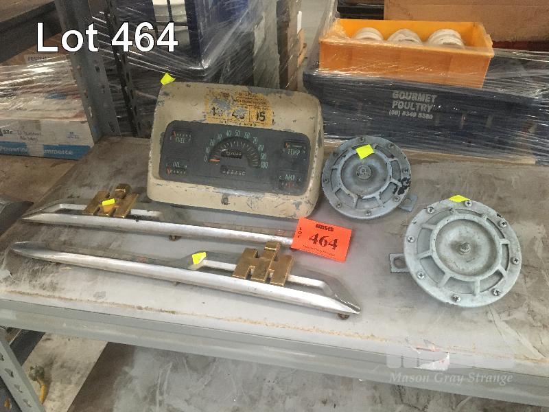 2 x INTERNATIONAL TRUCK BODY TRIM PIECES, VINTAGE DRIVER'S CONSOLE AND 2 x VINTAGE DISC HORNS.