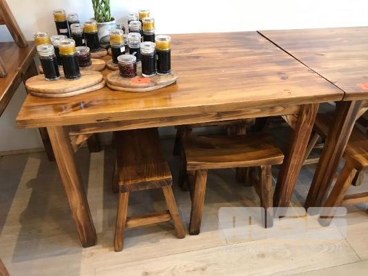 STAINED PINE TIMBER ORIENTAL STYLE DINING SUITE, RECTANGULAR TABLE & 4 x STOOLS 1200 x 1000mm