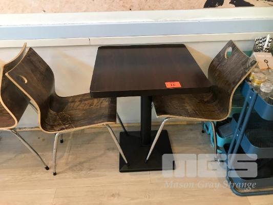 TIMBER LAMINATE SQUARE DINING TABLE, 60 x 600mm & 2 x DECORATIVE PLYWOOD CHAIRS